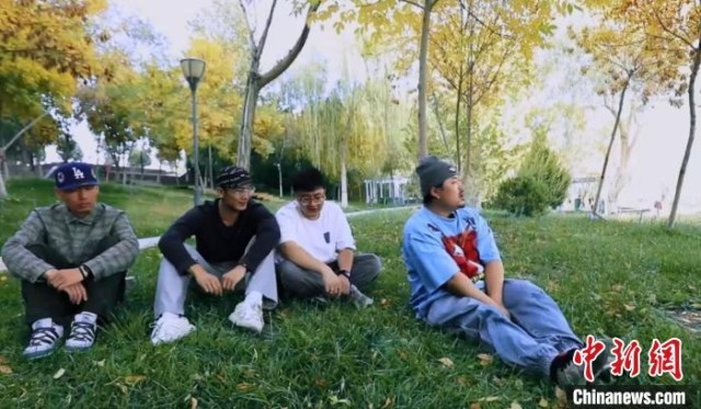 薛承祚(右一)和好友用“疆味儿”说唱赞美家乡喀什。(受访者供图)