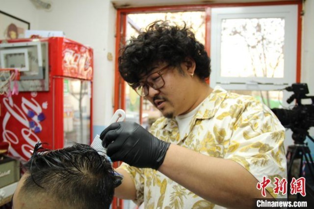 正在店里理发的薛承祚。(马晓东 摄)