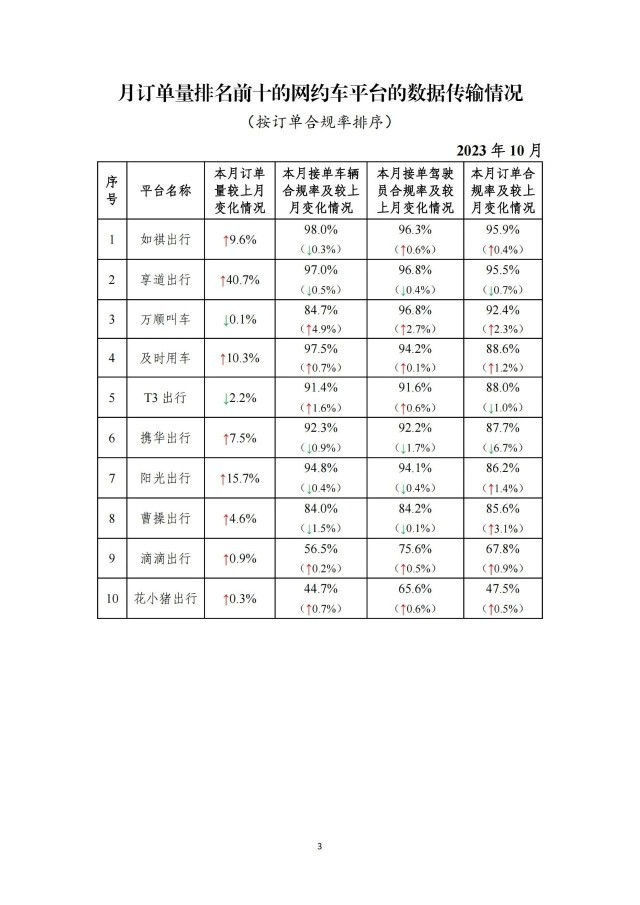 一、在订单量前10名的网约车平台中,订单合规率最高的是如祺出行,最低的是花小猪出行。在订单量前10名的平台中,按订单合规率(指驾驶员和车辆均获得许可的订单量占比)从高到低的分别是如祺出行、享道出行、万顺叫车、及时用车、T3出行、携华出行、阳光出行、曹操出行、滴滴出行、花小猪出行。本月订单合规率增长前3名的依次是曹操出行、万顺叫车、阳光出行;增长最后3名的依次是享道出行(-0.7%)、T3出行(-1.0%)、携华出行(-6.7%)。
