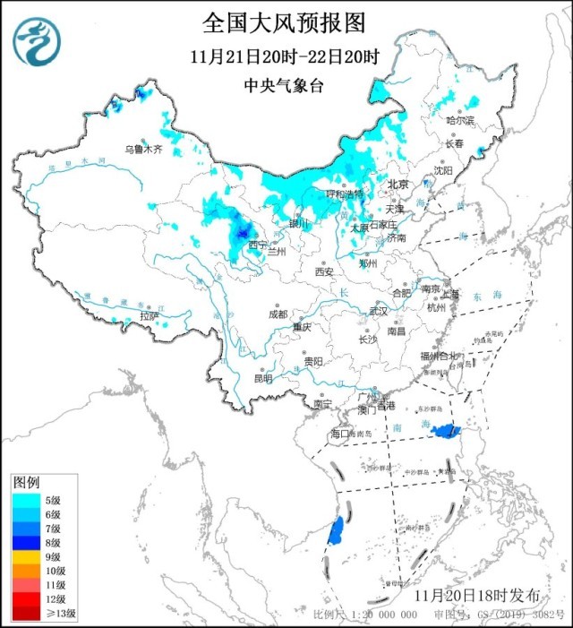 11月21日20时至22日20时,新疆北部、内蒙古大部、甘肃西北部、青海北部、宁夏北部、陕西北部、山西大部、河北西部、黑龙江西部、吉林东部等地部分地区将有5~6级、阵风7~8级的大风;巴士海峡、南海中东部和西南部海域将有7~8级、阵风9级的大风。