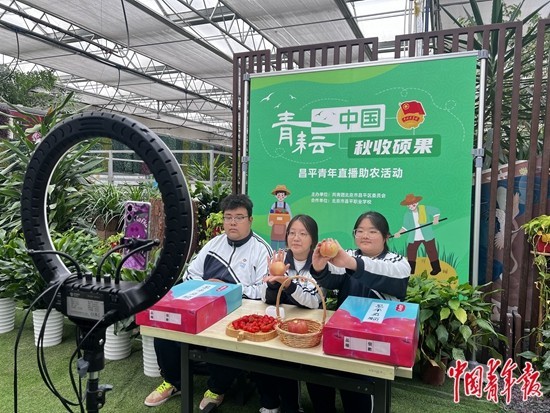 这是团北京市昌平区委举办的“青耘中国·秋收硕果”直播助农活动。两个小时的直播吸引了1万余人次观看,累计销售310箱苹果、186斤番茄,为农户增收共计2.6万余元。合作社的农户们握着学生们的手,连连道谢。