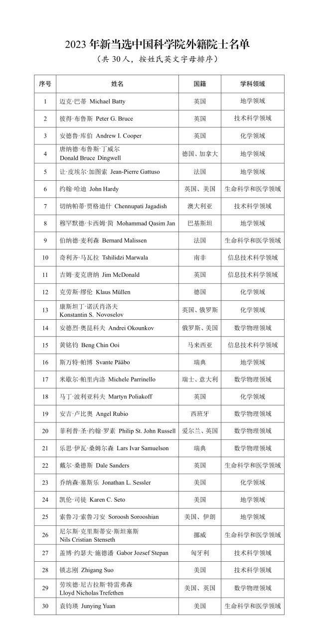 中国青年报客户端北京11月23日电(中青报·中青网见习记者 杨洁 记者 邱晨辉)今天,中国科学院、中国工程院分别公布2023年院士增选当选外籍院士名单,中国科学院选举产生30名外籍院士,中国工程院选举产生16名外籍院士,共计46人当选。