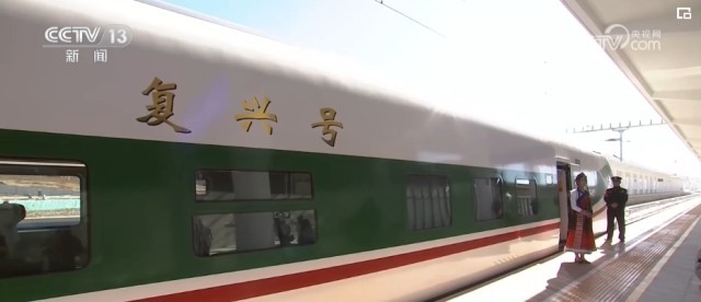 总台记者 刘文杰:这是一款特别针对滇藏铁路沿线高原、高寒环境设计的动车组。整列车的涂装是以“中国红”为腰带、以“国槐绿”为窗带,用“长城灰”进行点缀,整体外观大气优美。