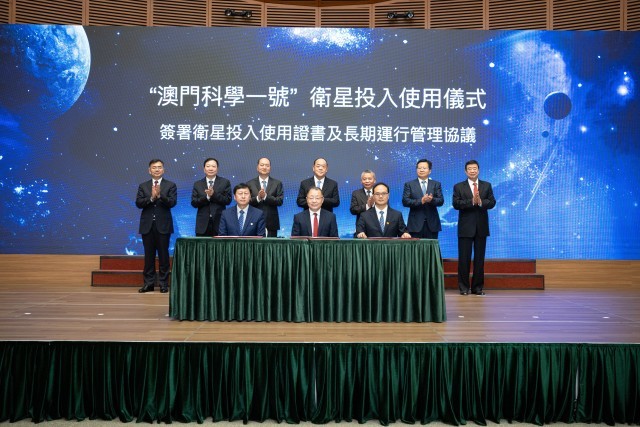澳门特别行政区行政长官贺一诚、中央人民政府驻澳门特别行政区联络办公室主任郑新聪、国家航天局局长张克俭出席投入使用仪式,共同见证签署“澳门科学一号”卫星投入使用证书、长期运行管理协议。国家航天局总工程师李国平出席投入使用仪式。