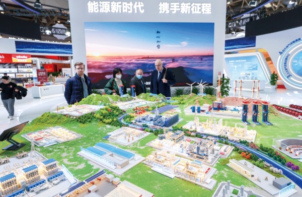 28日,首届中国国际供应链促进博览会在北京开幕。图为观众参观中石油展台的清洁能源利用项目沙盘。(中新社)