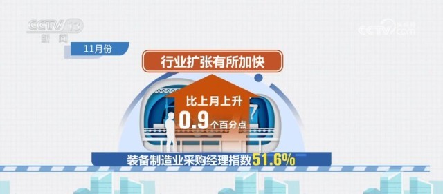 专家指出,新动能生产端较快上升是支撑11月制造业生产保持增长势头的主要因素。从重点行业看,11月份,高技术制造业采购经理指数为51.2%,比上月上升2.0个百分点,重回扩张区间。装备制造业采购经理指数为51.6%,比上月上升0.9个百分点,行业扩张有所加快。