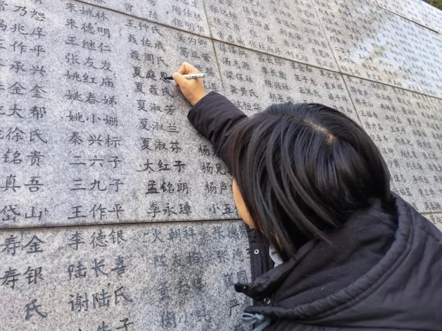 家祭当日,外孙女夏媛代替夏淑琴,用黑笔给“哭墙”上家人的姓名“描新”。“对全家来说,‘哭墙’是祭奠那场战争中死去亲人唯一的地方,‘描新’是提醒我们不要忘记这段历史。”夏媛说。