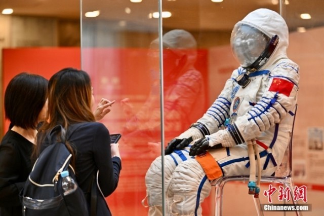 11月30日下午,由香港特区政府和中国载人航天工程办公室联合主办、康乐及文化事务署筹划的“中国载人航天工程展”在香港科学馆举行新闻界预展。展出超过25组展品,包括神舟飞船返回舱、舱内航天服、中国空间站模型、多支火箭的模型如长征二号F、长征七号、长征五号B运载火箭,以及新一代载人飞船和月面着陆器的模型,这是首次面向香港社会全面系统展示载人航天工程发展历程和建设成就。图为现场人士观看舱内航天服。中新社记者 李志华 摄