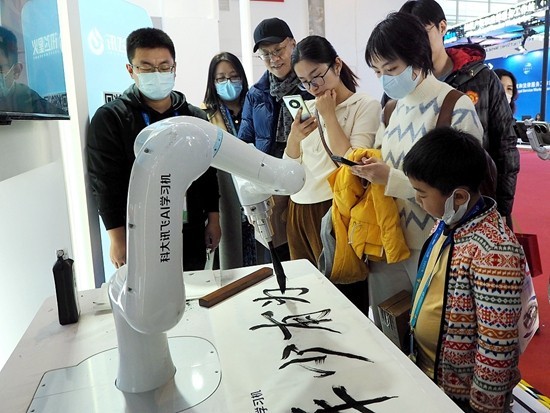 12月2日,北京国际展览中心(顺义馆),观众在链博会上体验AI书法机器人。视觉中国供图