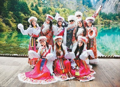 图为台湾青年身穿藏族服饰在九寨沟景区留影。