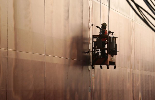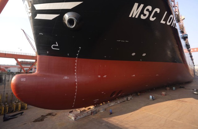 12月5日,在江苏扬子鑫福造船有限公司,工人在船坞内为一艘集装箱船刷漆。