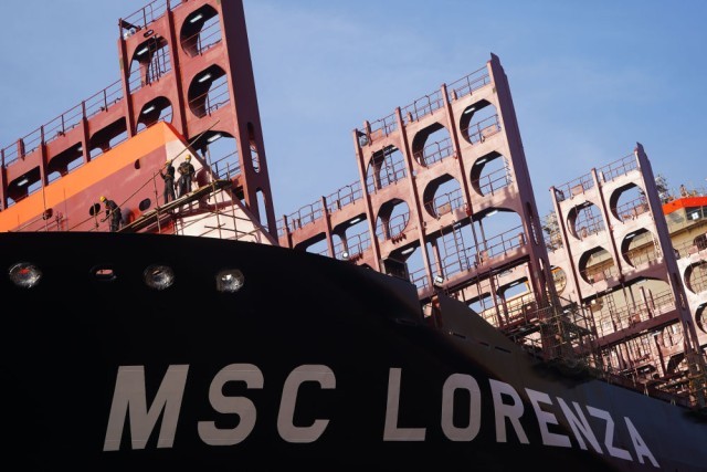 12月5日,在江苏扬子鑫福造船有限公司,工人在一艘集装箱船上作业。