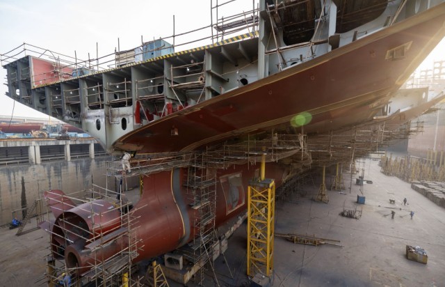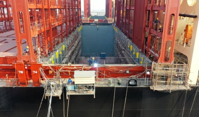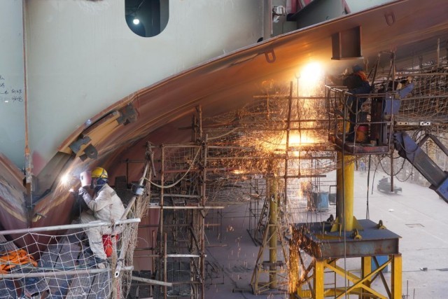 12月5日,在江苏扬子鑫福造船有限公司,工人在船坞内作业。