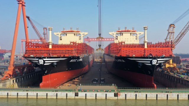 12月5日在江苏扬子鑫福造船有限公司拍摄的两艘即将出坞的集装箱船。