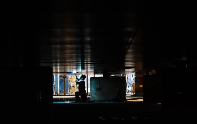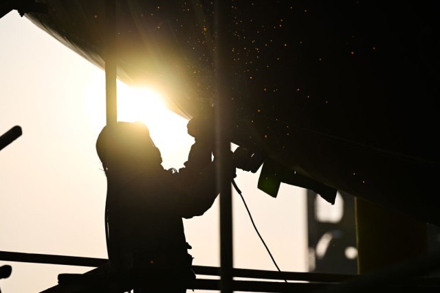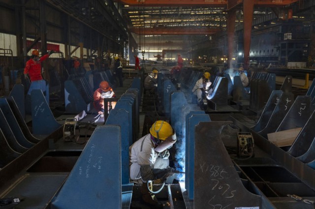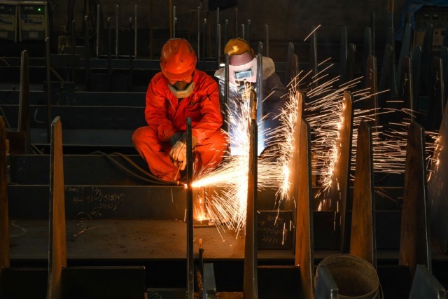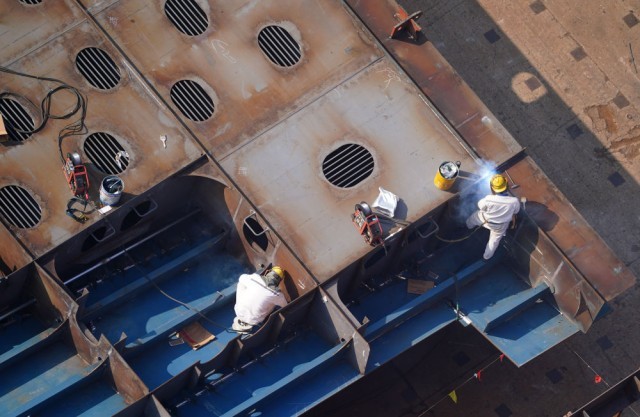 12月5日,在江苏扬子鑫福造船有限公司,工人在加工车间进行焊接作业。