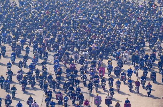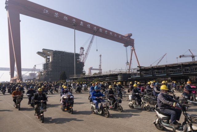 12月5日,在江苏扬子鑫福造船有限公司,工人在中午下班时骑车离开厂区。