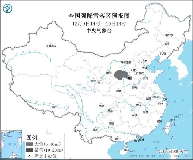 预计12月9日14时至12月10日14时,陕西北部、山西中南部等地部分地区有大雪,其中,山西南部等地局地有暴雪(10~12毫米)。上述部分地区新增积雪深度3~5厘米,局地可达8厘米以上。