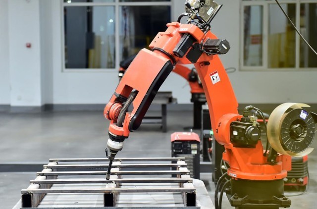 10月26日在山东省聊城市临清市新森机械有限公司拍摄的焊接机器人。新华社记者张善臣 摄