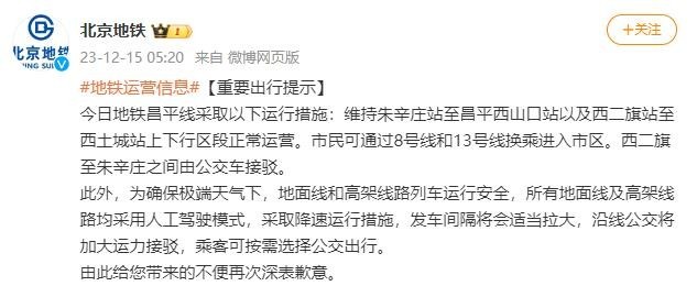 北京地铁:今日昌平线两区段维持运营,西二旗至朱辛庄之间由公交车接驳