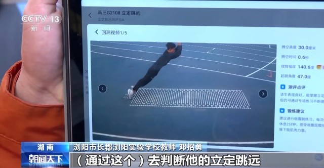 在人工智能技术的辅助下,体育教师也可以更精准地掌握不同学生的体能特点。在湖南浏阳这所中学,体育教师正在为学生测试立定跳远,运动摄像头实时拍摄学生运动姿势,通过智慧体育AI测评系统,分层次解析学生的姿势动作。
