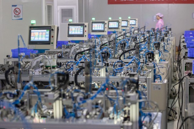 8月14日,在赣州讯康电子科技有限公司,工作人员从T1-T2全自动穿环机旁走过,该机器生产磁性元器件。新华社记者 才扬 摄