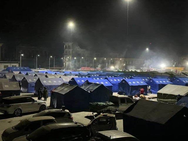 一夜余震不断,医疗、消防、电力、通信等救援车辆相继赶至现场。震后,大河家镇受灾群众被疏散到周围广场等地,积石山县大河家中学将学生疏散至操场,寄宿学生已由家长接回。