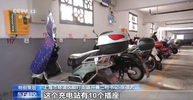 上海市杨浦区殷行街道开鲁二村书记 张蓓芳:这个充电站有10个插座,可以充10辆电瓶车。电瓶充足电之后,会自动断电。24小时有监控,一旦有火情的话,会第一时间通知管理人员到达现场。