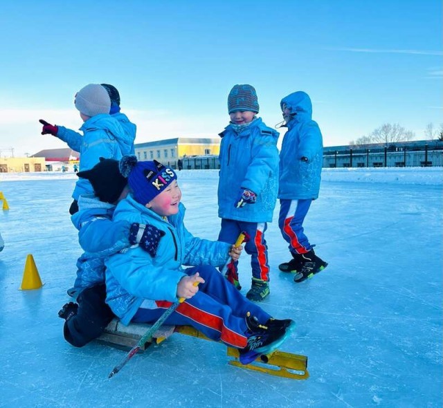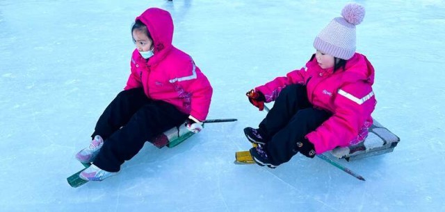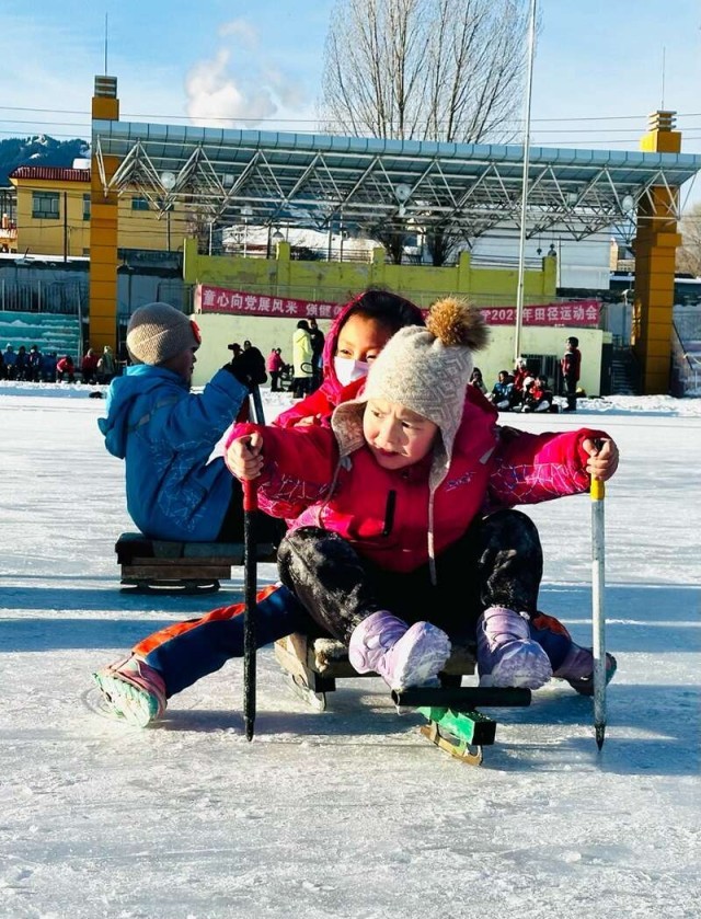 低年级小学生两人一组,一前一后坐在滑冰板上,前方学生双脚踩在脚蹬上把控着方向、两手举着滑冰仗,借助插入冰面的力量向前滑行,坐在后方的学生两脚在冰面上辅助滑行,两人协作共同感受着"溜冰"的乐趣。