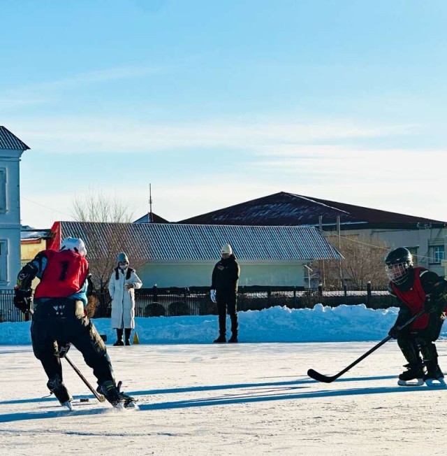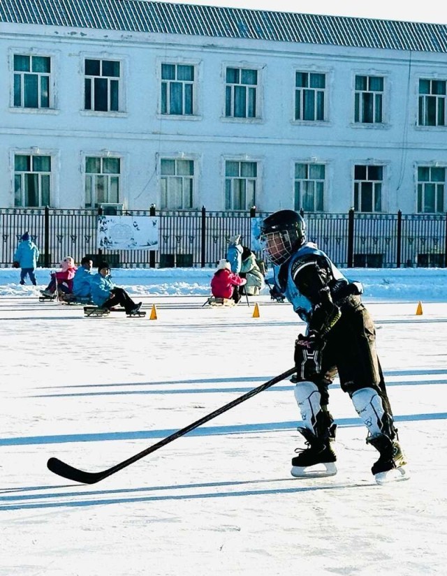 随着哨声响起,一场高年级学生的冰球比赛开始了。冰球小将们紧密配合,挥着冰球杆在冰面上争抢射门得分机会。比赛时,江布力的头盔扣掉了,坚持打到休息环节,队友叶斯泰和考萨尔赶紧帮他扣紧。