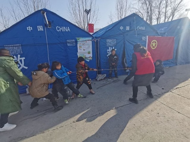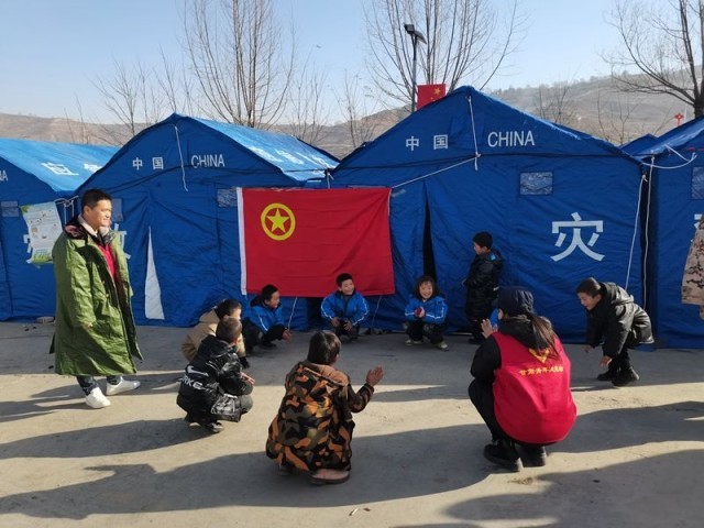 中青年报客户端甘肃积石山12月22日电(中青报·中青网记者 马富春 文并摄)12月21日,在甘肃临夏积石山县刘集乡高李村安置点,共青团日间照护站在救灾帐篷里建成并展开服务。在团甘肃省委“爱心驿站”青年志愿者的陪伴带领下,孩子们可以在帐篷里学习、做手工、玩游戏。
