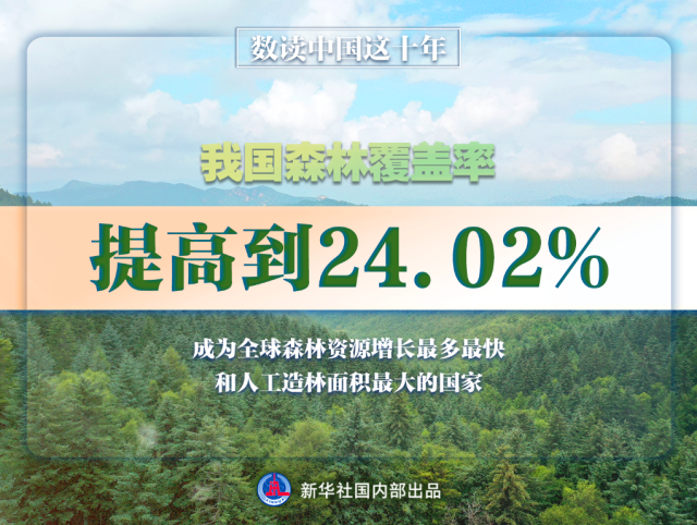 人们用勤劳的双手栽下一棵棵树苗、种下一片片绿草,让绿意点染祖国大地。我国在世界范围内率先实现了土地退化“零增长”,荒漠化土地和沙化土地面积“双减少”。我国森林覆盖率提高到24.02%,成为全球森林资源增长最多最快和人工造林面积最大的国家,是全球“增绿”的主力军。