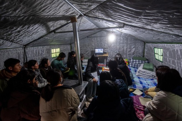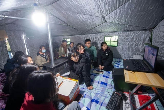 12月22日,在积石山县大河家镇大河村安置点,部分高中学生在帐篷中听课。人民网记者 翁奇羽摄