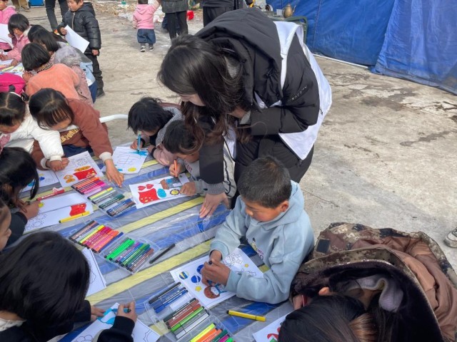 记者见到冯小霞时,她和伙伴们正在受灾较重的大河家镇大河村救灾安置点指导孩子们画画。孩子们时而描线,时而涂色,不时发出的笑声在寒冷的空气中呵出白色的“小恐龙”。