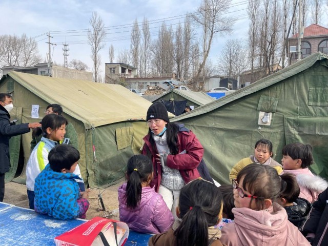 21日上午,冯小霞和24名同伴就从与积石山县毗邻的广河县抵达灾区,开展志愿服务。地震发生后,和冯小霞类似,来自多地的志愿者化身“帐篷城”里的“孩子王”,为大家开设了绘画、文化课程辅导、防灾救灾知识等内容的志愿服务。