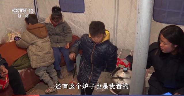 张春蕾的父亲 张环:帐篷先给老人和小孩,晚上全部在帐篷里面围着炉子坐着取暖,我们年纪比较轻一点的大人就在外面再生一堆火取暖。周四下午又给我们发了一顶帐篷,现在不用在外面取暖了,我们可以在帐篷里面住了。