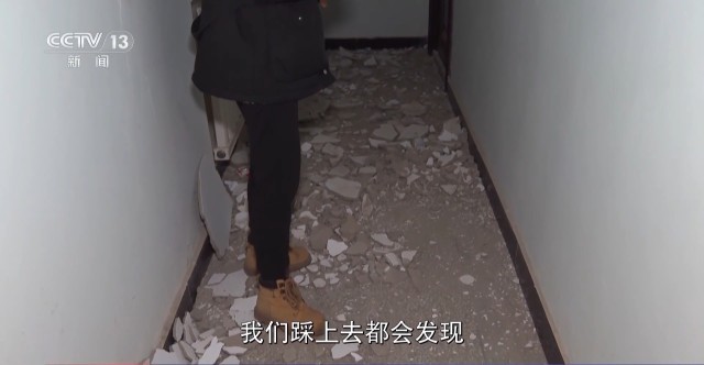 在积石山县左家小学,在楼道里有大面积的掉落的水泥块,我们踩上去都会发现它非常厚,有时候还会站不稳。除了楼道里有大面积墙皮掉落,还有砖块的掉落,在房间里边也有不同程度损伤。
