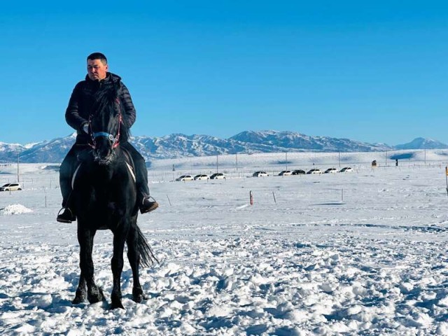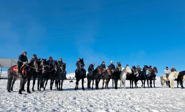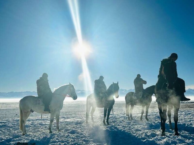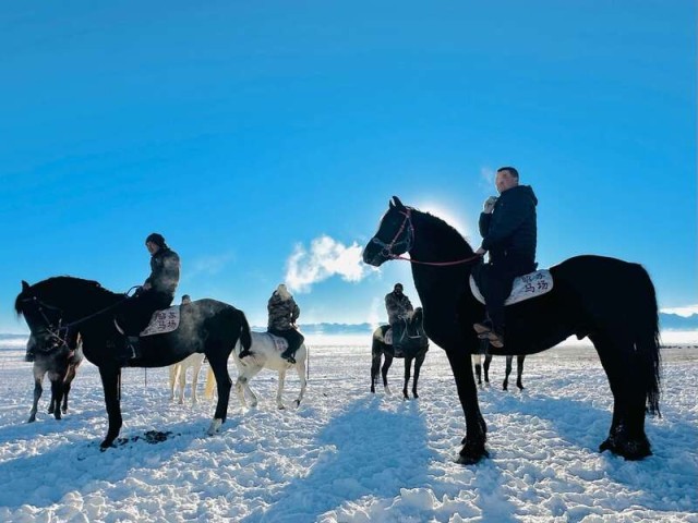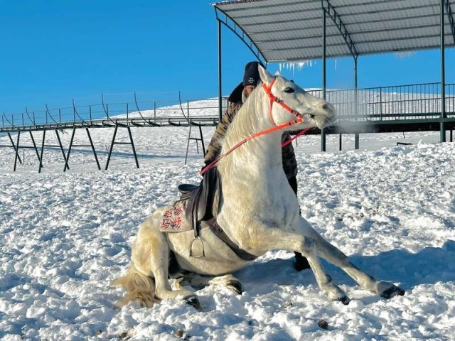 12月23日,中青报·中青网记者跟随"四季看新疆之追着雪花看新疆"主题采访团走进位于伊犁哈萨克自治州昭苏县西南处喀尔坎特大草原的天马文化园。隆冬时节,草原上白雪皑皑,数十名牧民在这里围观"万马奔腾"、刁羊比赛。