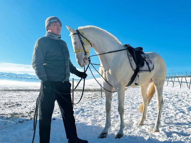 12月23日,新疆维吾尔自治区伊犁哈萨克自治州昭苏县天马文化园,牧民向游客展示马匹。中青报·中青网记者焦敏龙
