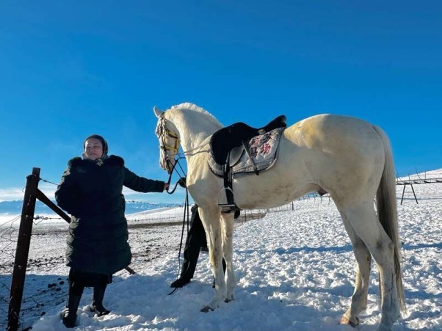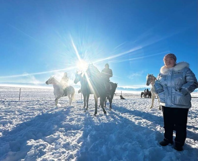 12月23日,新疆维吾尔自治区伊犁哈萨克自治州昭苏县天马文化园,游客与马匹合影。中青报·中青网记者焦敏龙