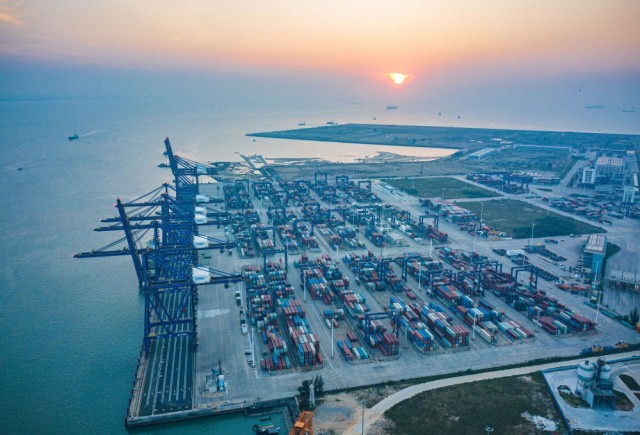 ↑11月27日在海南省洋浦经济开发区拍摄的洋浦国际集装箱码头(无人机照片)。新华社记者 蒲晓旭 摄