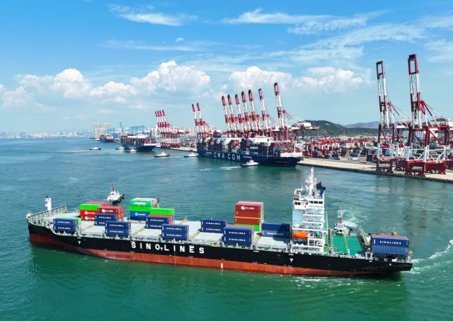 ↑8月30日,“中外运海口”轮缓缓驶离山东港口青岛港,驶向印度钦奈港(无人机照片)。今年以来,山东港口青岛港“一带一路”国家和地区箱量保持两位数增长。新华社发(张进刚摄)