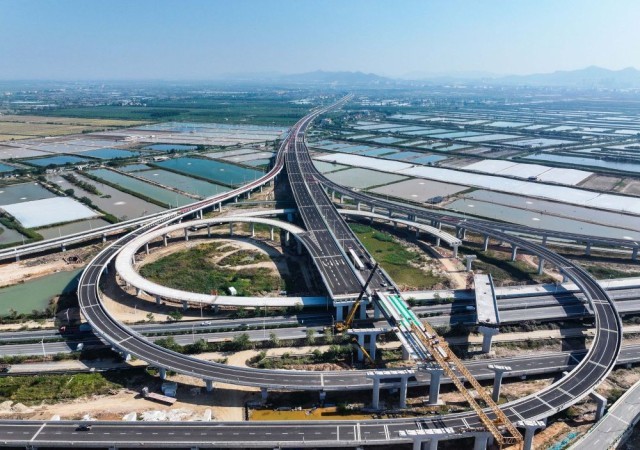 ↑12月8日拍摄的广东鹤港高速高栏港枢纽(无人机照片)。全长34.5公里的鹤港高速东连港珠澳大桥西延线,西接黄茅海跨海通道,共同组成粤港澳大湾区基础设施“硬联通”交通主干线之一。新华社记者 刘大伟 摄
