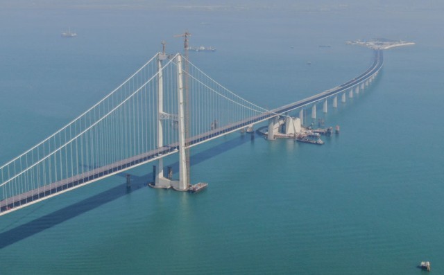↑11月28日,粤港澳大湾区超级工程深中通道主线正式贯通,这是深中通道伶仃洋大桥东塔及西人工岛(无人机照片)。新华社记者 邓华 摄