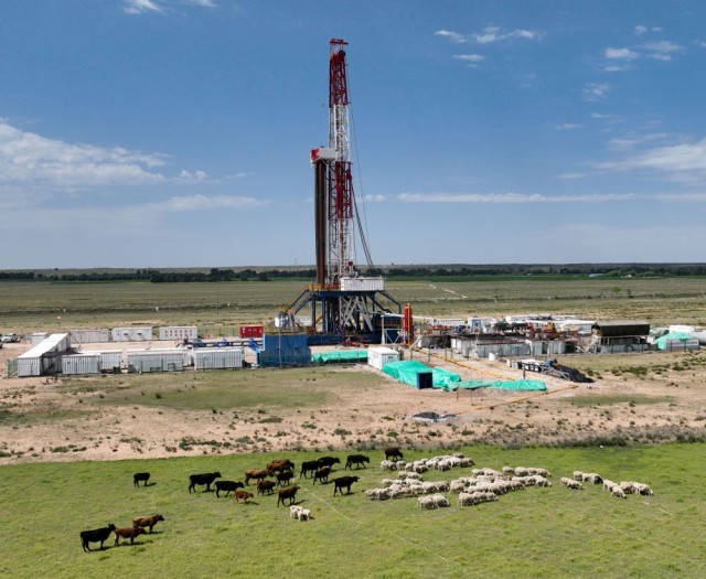 ↑7月24日,在长庆油田苏里格气田一处钻井平台旁,牛羊悠闲地吃着草(无人机照片)。中国石油长庆油田苏里格气田处于内蒙古鄂尔多斯乌审旗,毛乌素沙地腹地,为我国目前已探明的最大整装气田,是保障京津地区、内蒙古周边区域的主力气源地。新华社记者 王毓国 摄