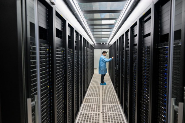 ↑11月28日,工作人员在内蒙古中科超算科技有限公司对设备进行巡检。近年来,内蒙古自治区呼和浩特市和林格尔新区发挥资源和区位优势,大力培育以大数据、云计算为特色的电子信息技术产业集群,构建数字经济发展新格局。新华社记者 李志鹏 摄