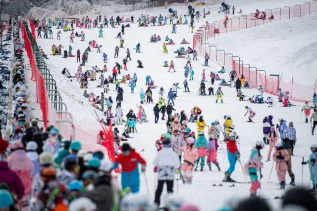 ↑12月17日,滑雪爱好者在湖北神农架国际滑雪场滑雪。得天独厚的自然地理条件为当地冰雪产业的发展提供优质资源。新华社记者 伍志尊 摄