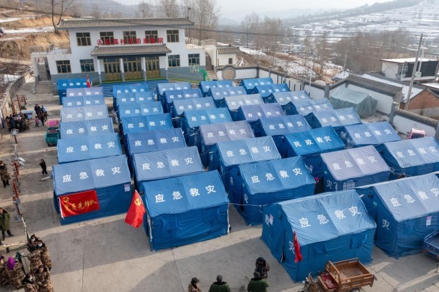 12月23日,甘肃临夏州积石山县柳沟乡尕集村幸福互助院前的一片水泥地上,37顶应急帐篷整齐排列,党旗招展,“党员先锋队”旗帜格外醒目。人民网记者 翁奇羽摄