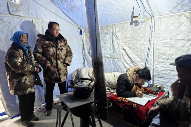 马力克挨家挨户走访时,正好一顶新帐篷运到了安置点。驻村干部和村民一起动手,拆开包装,组装骨架,固定钢丝绳,覆上保温层,盖上防水布,很快帐篷就搭了起来。