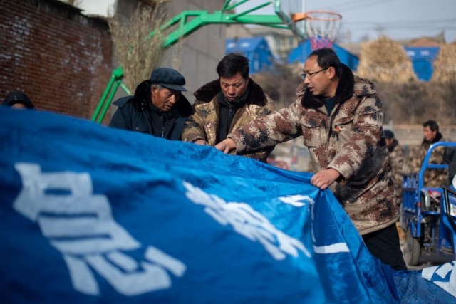 12月23日,在积石山县柳沟乡尕集村五社安置点,柳沟乡副乡长马力克和村民一起搭帐篷。人民网记者 翁奇羽摄