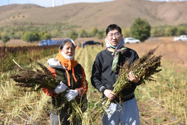 10月1日,在沽源县白土窑乡小西沟村,当地种植户王秀梅和她的儿子赵擎宇抱着收获的红藜麦合影。新华社记者 黄晓勇 摄